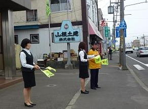 9月9日(金)は、白糠町“旗の波作戦”の日でした。午前10時40分から約30分間、会社前の国道沿いに立ち、走行する車両に安全運転の黄色い旗を振りました。