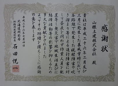 これは、弊社が釧路開発建設部様より請け負っている国道の維持除雪工事において、特に今年の2月、3月の暴風雪の際、工区に関係なく、お互いに助け合って除雪に当たったことに対する感謝状です。