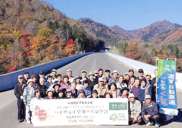 約80名の参加者は、2台のバスに分乗したのですが、同乗してくださった釧路開発建設部 道路計画課 道路調査官の井内彰宏様並びに釧路道路事務所 計画課 課長 高山博幸様から、路線の特徴や事業経緯についてのレクチャーを受ける機会にも恵まれました。