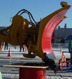ドラム缶の上に作った土の型を雪に見立てて、マルチブレードで崩します。