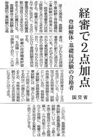 今回は、解体工事と基礎杭工事について、資格を取得すれば、技術者が経審において加点されるというものですね。