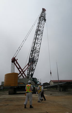 基礎となる杭打ち工事の最中で、クローラクレーンを使用したスケールの大きい杭打ち作業に圧倒されました。クローラクレーンや杭打ち機など、多くの機械を使用しますので、その使用に際しては、機械の保守管理、機械周りの人・物への対策、などをしっかりお願いしたいですね。