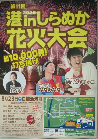 いよいよ夏のお楽しみ、『港inしらぬか花火大会』 が8月23日(土) に開催予定です。1万発の打ち揚げ花火が、白糠漁港の空を彩ります。今年は、モノマネのMr.シャチホコさんや歌まねの