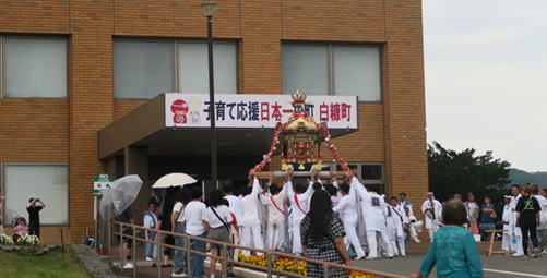 白糠町本町の厳島神社例大祭は7月26日(土)、27日(日) でした。26日は30℃超えが2日連続した後の日で、曇天、今にも雨が降りそうな中での神輿渡御です。この日は23℃と、気温も少し落ち着いた日でしたが、神輿を担ぐ皆さんは汗びっしょり。地域の皆さんが見守る中、午後3時ころに、白糠町役場正面玄関にて宮入となりました。何回か押し戻された後、仕切り直す宮入に、声援が飛んでいました。担ぎ手の確保や資金の調達など様々な困難がある中での例大祭の開催は、実行委員の皆さんの努力によるところが大きいのだと思います。今年の大漁を願うとともに、漁師さんたちの無事を祈る心が、神様に届くようにと思います。 (※百)