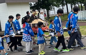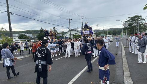 「路地裏」 のライブがあったりと 楽しい夜で、やっぱり一番盛り上がったのは 「路地裏」 のライブ。昨年より多くの人が見に来て下さり リズムに合わせて手拍子をしたり踊ったりとライブを楽しんでいました。夜店も大盛況で、神輿会で出店していた焼きそば・とり串・ぶた串は完売になりました。子供たちもお小遣いを持って遊びに来ていました。翌日は小雨が降ったり止んだりと蒸し暑い日でしたが、町内を子供神輿と御神輿が練り歩きました。本通りでは西庶路婦人部の皆さんが踊る西庶路音頭のパレードがあり、皆さん元気に踊っていました。御神輿では今年は34団体127人の方たちが恵庭、余市などなど、北海道各地から担ぎに来られました。毎年手作りの豚汁を作っておもてなしをしているのですが、美味しいと何回もお代わりをしてくださった方もいて、作り甲斐がありとても嬉しいです。町の本通りを御神輿2基が渡御しているのはかっこよく、今年は女性の方がお神輿に乗り調子をとっていたのが印象的でした。また御神輿を担いでいた方たちも暑さに負けずイキイキと素敵でした。こういった地域ぐるみのお祭りは幾つになっても楽しいですね。私も行事に参加し