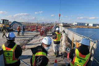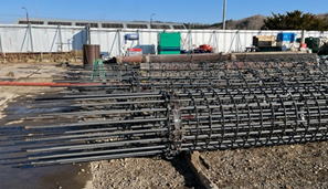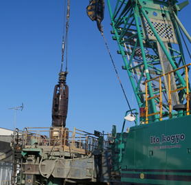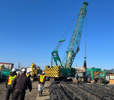 まずは、杭打ちの現場です。そもそも杭打ち工事とは、軟弱地盤における構造物の建設において、地下の硬い地盤まで深く杭を打ち込み、構造物を支える基礎工事を指します。この現場は、場所打ち杭工法を採用しています。あらかじめ地盤を掘削し、削孔された孔内に鉄筋かごを挿入し、コンクリートを打設して杭をつくります。オールケーシング工法といって、2トンのハンマーグラブで地盤を掘削して土を出しているところです。孔に挿入する鉄筋かごも用意されています。杭の深さは52m。この日の杭は6本目だそうです。騒音や振動が少ない工法ではありますが、白糠町の市街地における工事ですので、地域住民のみなさんの理解を得ながら、工事を進めていただきたいと思います。