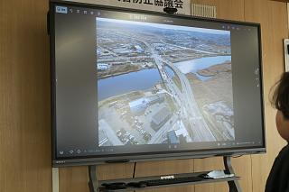 釧路町にかかる橋梁の床版を撤去しています。床版カッターで ある程度の大きさに切り出して、ラフテレーンクレーンで吊って、取り外すという作業を繰り返します。:現在この橋は、仮橋を掛けて、皆さんには仮橋を通行していただいています。事務所では、デジタルホワイトボードで、橋の全体像を確認することができます。通行量の多い橋ですので、交通事故等にも注意して施工をお願いします。