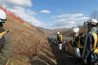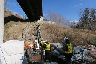 ここは、道東道に面した法面の補修工事です。法面に鉄筋を挿入して補強します。材料等を置いておく場所が高速道路の下にしか確保できないので、そこから法面までモノレールで材料を運びます。作業員の法面からの落下や、材料落下に気を付けて、作業を進めてくださるようお願いします。