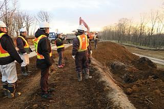 造成工事の現場です。ひたすら土を掘って、ダンプで運搬する作業が続きます。足元がぬかるんでいるので、敷鉄板を敷いて、ダンプはその上を走ります。注意してゆっくり運転している様子がうかがえます。これから本格的な冬になるので、凍結路面などに気を付けて、作業をお願いします。