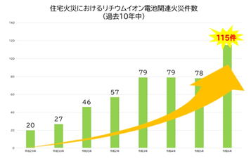 最近、飛行機の機内や住宅で モバイルバッテリーが発火したといった、リチウムイオン電池を使用した製品の発火について、ニュースやSNSで目にすることが増えました。リチウムイオン電池は、スマートフォンやノートパソコンなど、生活する上で欠かせない多くのものに使用されているので、ニュースを見るたびに心配になります。東京消防庁のデータを見てみると、ここ数年でリチウムイオン電池に関連した火災が急激に増えていることがわかります。リチウムイオン電池を使用した製品について、強い衝撃を与えてはいけないことや、暑すぎる場所や寒すぎる場所での使用は控えた方が良いということは広く周知されていますが、それに加えて、製品を正しく使用することも発火を防ぐ上で重要であるといいます。たとえば、発生件数の多いモバイルバッテリーの発火原因は、長時間の充電やモバイルバッテリーを充電しながらスマートフォンを充電するなど、誤った使用による発火が約6割だそうです。リチウムイオン電池を使用している製品を扱うときは、より一層丁寧に、正しく扱うよう気をつけた方が良いということでしょう。