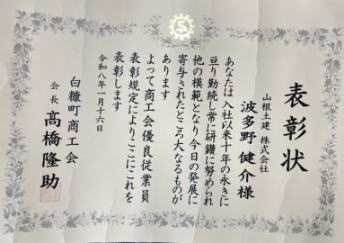 今回、弊社から2名の職員が、白糠町商工会さまより、優良従業員 (永年勤続) 表彰を頂きました。ありがとうございます。工事部建築グループの波多野健介と巡回員の岡本哲美の2名です。両名とも勤続10年の表彰です。「まだ10年だったの?」 って言うくらい、ずうっと一緒に働いているイメージのとおり、頼もしい存在です。後輩もそれなりに出来て、指導的立場になってきたと思います。自らの研鑽を続けるとともに、チームを牽引する力になってくれると嬉しいです。 (※百)