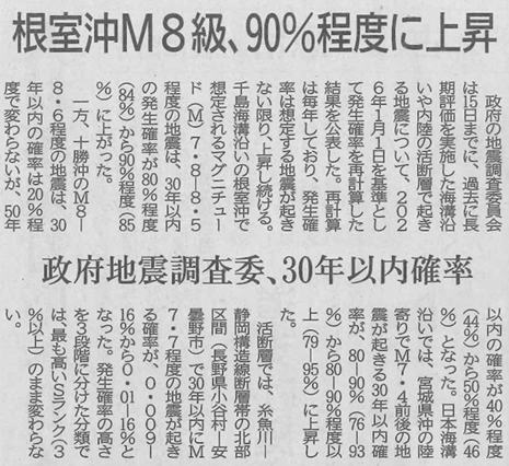 の記事には、千島海溝沿いの根室沖で想定されるマグニチュード (M) 7.8~8.5程度の地震の 30年以内の発生確率が、80%程度から90%程度に上がったとあります。日本中の