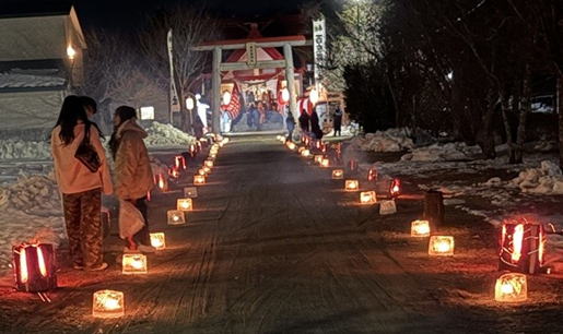 今年は少し出遅れて1時近くになってしまいましたが、縁起よいとされるお賽銭金額で 「今年もよろしくお願いいたします。」 とお参りしました。、既に人気も少なく、お餅がもらえないと思っていましたが、たくさん頂きました。神社鳥居まで続く参道には西庶路在住の石井さん作成のスウェーデントーチと、庶路学園の生徒さんが作成したアイスキャンドルが綺麗でした。今年はいつもより綺麗だねと話しながら参道を楽しんで帰宅しました。雪も降らなくて、穏やかな日で良かったです。毎年、準備をして下さる方々、ありがとうございます。新年そうそう篝火で癒されました。