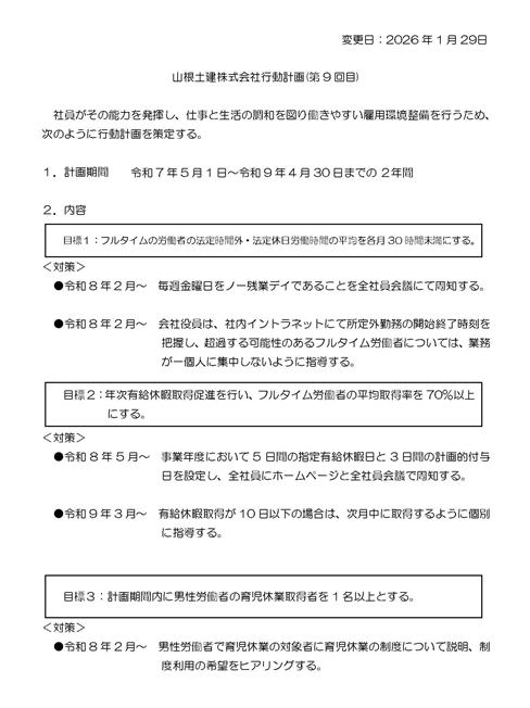 昨年から くるみん認定のための申請手続きを行う中で、課題も複数見つかりました。次回の くるみん認定取得に向けて、2025年5月から始まっている第9回目の 「山根土建株式会社行動計画 (第9回目)」 を2026年1月29日に変更しました。