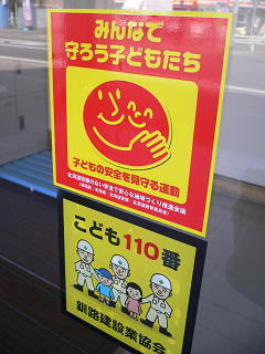 右のようなポスター、ステッカーを貼って、子供達が犯罪等に巻き込まれることのないよう注意喚起を促すと共に、助けを求められた時には速やかに保護し、警察へ通報を行う、子供達の安全確保を図っていくことで地域の安全のお力になれたらと思います。