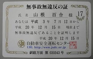 ところで、この“セーフティラリー北海道2008”で無事故・無違反を達成すると、一人一人にSDカードという物が届きます。運転免許証と同じ大きさのカードです。何年以上無事故・無違反かによってSDカードの色は異なります。10年以上だと右のように金色です。4年以上だと銀色、2年以上だと水色、1年以上だと若草色です。カードといっしょに、無事故・無違反を証明する「運転記録証明書」(A4判)も発行されます。