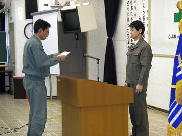 参加者全員で、安全スローガン唱和。『慣れた作業に予期せぬ危険、初心に戻って安全作業 ヨシ!』ちなみに、弊社職員、横山利夫作、最優秀作品です。
