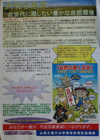 1.私たち自然の番人は、この自然環境が圏域のそして、全国民の財産であることを深く認識し、自らを律し、不法投棄、ポイ捨ては行いません。