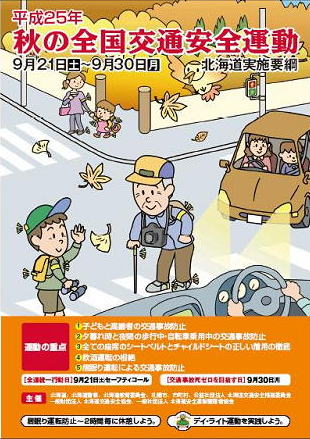 9月21日(土)〜9月30日(月)は、『秋の全国交通安全運動』の期間です。8月26日(月)現在、北海道の交通事故死亡者数は、98名。全国8位です。ワースト1を免れているとは言え、死者98名は相当な数です。