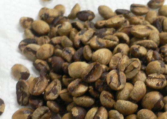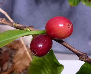 コーヒー豆の変化の様子です。まず実になる時は赤くて、採取して放置すると黒くてしなびてきます。この外皮を指で根気よく剥いて、ねばねばした豆の表面が乾くまで天日干しします。その後フライパンで煎ると、よく商店で見かけるコーヒー豆になるのです。