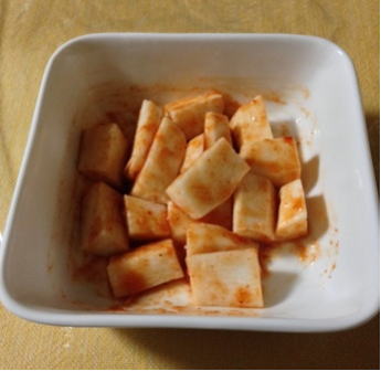 まず長芋の皮をむき、だいたい長さ2p、厚さ1.5pに切り、キムチの素を適量、味の素少々と混ぜ合わせるだけです。キムチの素を自分好みの辛さになるように量を調整すると、「簡単長芋のカクテキ」が出来上がります。