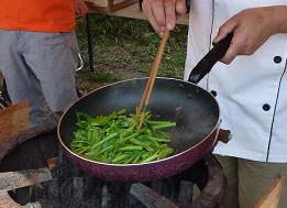 ←台湾の飛牛牧場から提供されていた空心菜炒め。オリーブオイルでニンニクを炒めた中に空心菜を加えて、塩、こしょうで味付けしたものです。仕上げにチーズをふりかけたら出来上がり。