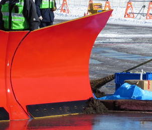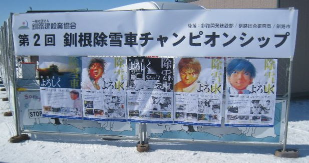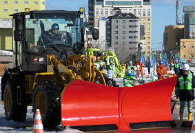 左カーブのコースに、雪に見立てた砂を置いて、どこまで綺麗に除去できるかを競います。いわゆる路側追従性を見る競技です。 参加者は、いずれもオペレーター歴10年以上のベテラン腕利き揃いですので、点数で差を付けるのは難しいようでしたよ。