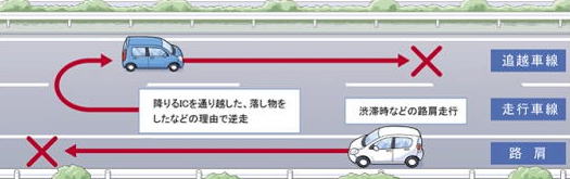 目的のインターチェンジを通り越した、走行中に落し物をしたなど、どんな理由があっても逆走をしてはいけません。また、サービスエリア/パーキングエリアから本線に戻る際に進行方向を間違えないよう注意しましょう。なお、逆走車が現れることがありうることを念頭に置いて走行しましょう。