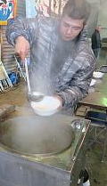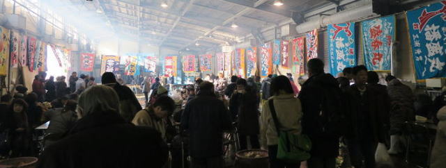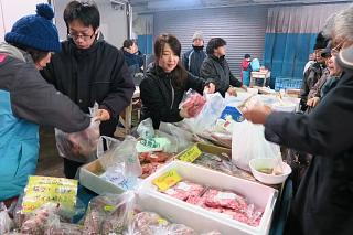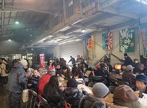 暖かい鉄砲汁も人気でした。友人、知人に海産物を贈れるばかりか、会場で美味しいものも頂ける、願ったりかなったりの即売会なのです。