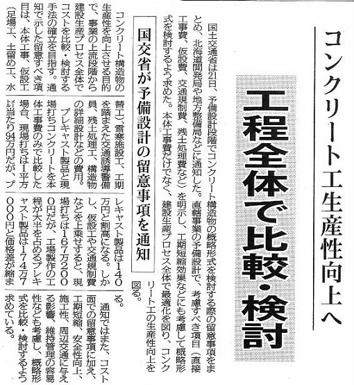 建設業の生産性向上については、先月号の “ちょっと一息” てもご紹介しましたICT土工などが話題ですが、4月25日(火)の北海道建設新聞ではコンクリート工の生産性向上が取り上げられていましたのでご紹介します。