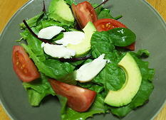 →写真は、ベビーリーフとトマトとアボカドのサラダにスカモルツァという柔らかめのチーズをのせたものです。