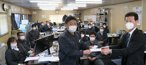 弊社の勤続表彰は、10年、20年、30年と続きます。この日は、弊社社長 山根浩より、金一封が渡されました。